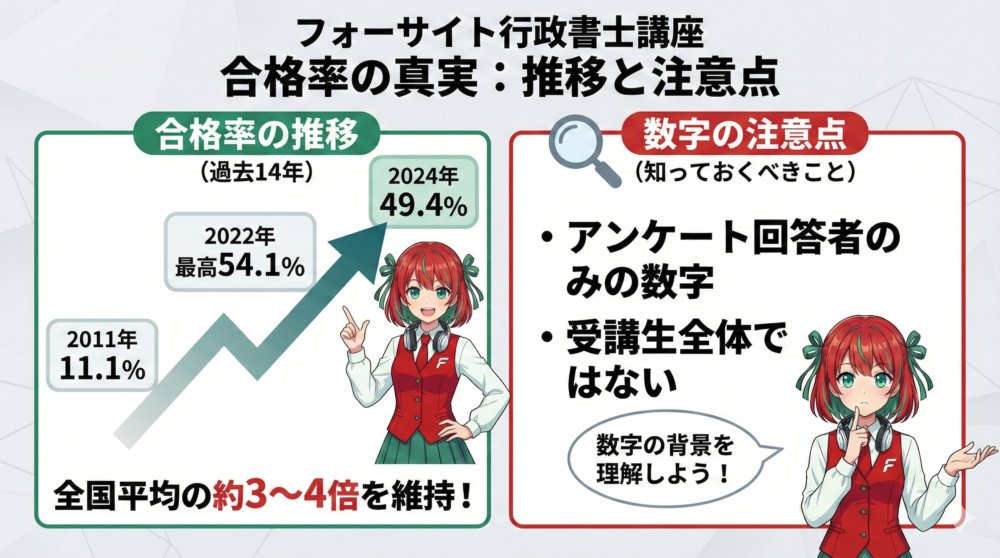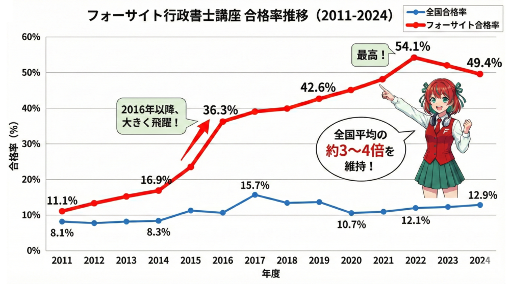 - フォーサイト行政書士講座の合格率は、2011年度の11.1%から2024年度の49.4%まで、長期的に上昇傾向を示している