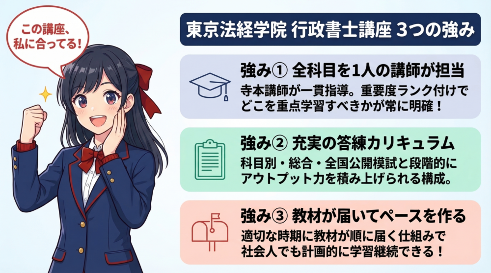 東京法経学院の行政書士 新・最短合格講座(総合コースA1)にはさまざまな強みがありますが、ここでは特に重要な3つの特徴を取り上げます。