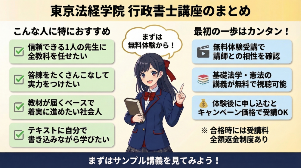 ここまで見てきた評判・特徴・比較・メリット・デメリットの内容を踏まえて、東京法経学院の行政書士講座が特に合う人と、他の選択肢を検討したほうがよい人を整理します。